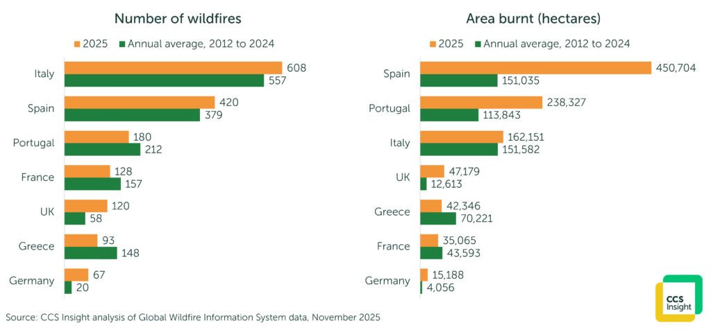 - Rising threats from climate change. In the EU, there was an average of 106 wildfires per year per member country between 2012 and 2024. The impact is increasing: the total area burnt in 2025 to date is 29.3% higher than the 12-year average. Storms and flooding are also becoming more damaging.