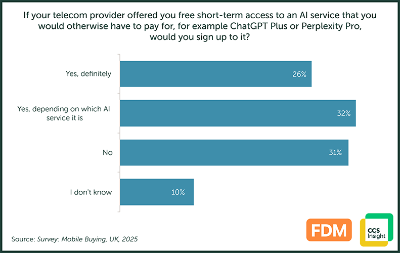 Our research suggests that mobile phone customers are cautiously receptive to this opportunity. In a recent CCS Insight survey of UK consumers, respondents were asked if they would be interested in free short-term access to a premium AI service.