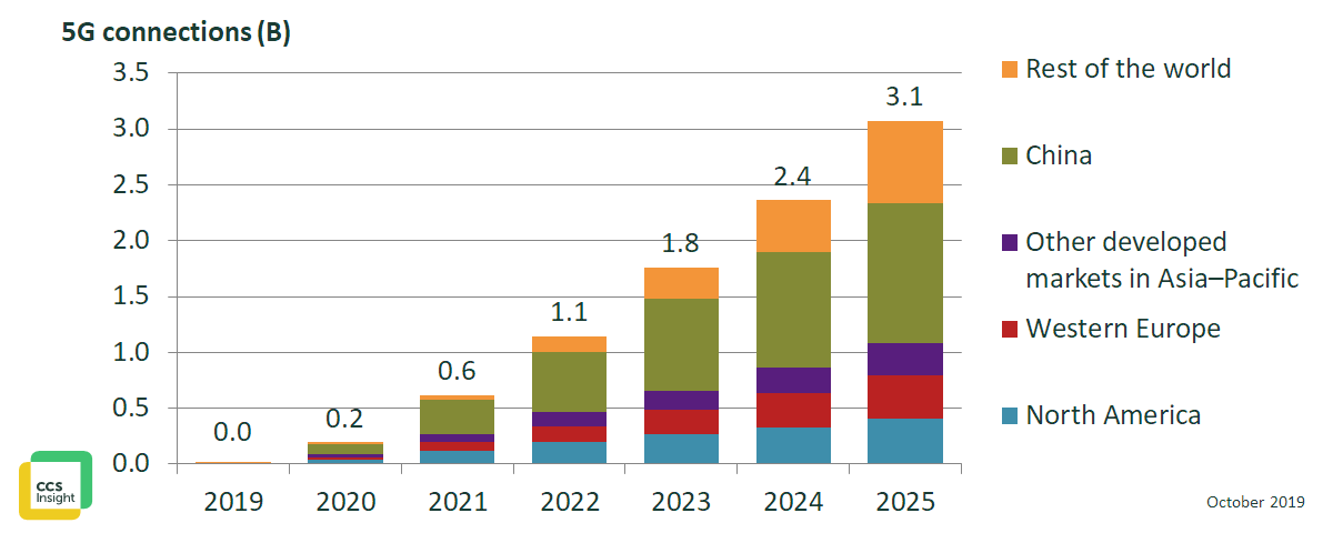 With commercial 5G services now launched in more than 20 markets, all eyes are on China, where 5G is set to go live in the coming days. According to CCS Insight’s latest 5G forecast, published today, China will become the world’s leading market for 5G early in 2020. Buoyed by swift roll-outs and a burning national ambition, uptake of 5G is set to be record-breaking, resulting in a huge 1.2 billion 5G connections in 2025, or more than 40% of the global total.