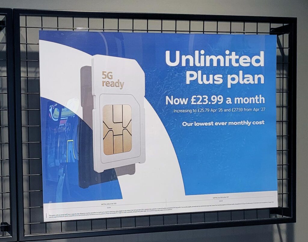On the mobile side, a big display showcasing an unlimited 5G SIM plan, priced at £23.99 a month, caught my eye. Our research reveals pent-up demand for the all-you-can-eat option, although I’m dubious whether people really need it. A quick web search shows that O2 also offers a 100 GB plan for £19.99, which feels like a better deal for most people.