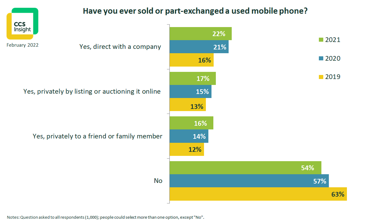 The research was conducted in December 2021. CCS Insight surveyed 1,000 UK mobile phone users aged 16 and over, representative of the population by age, gender and region. When answering questions, people were asked to consider their primary mobile phone for personal use.