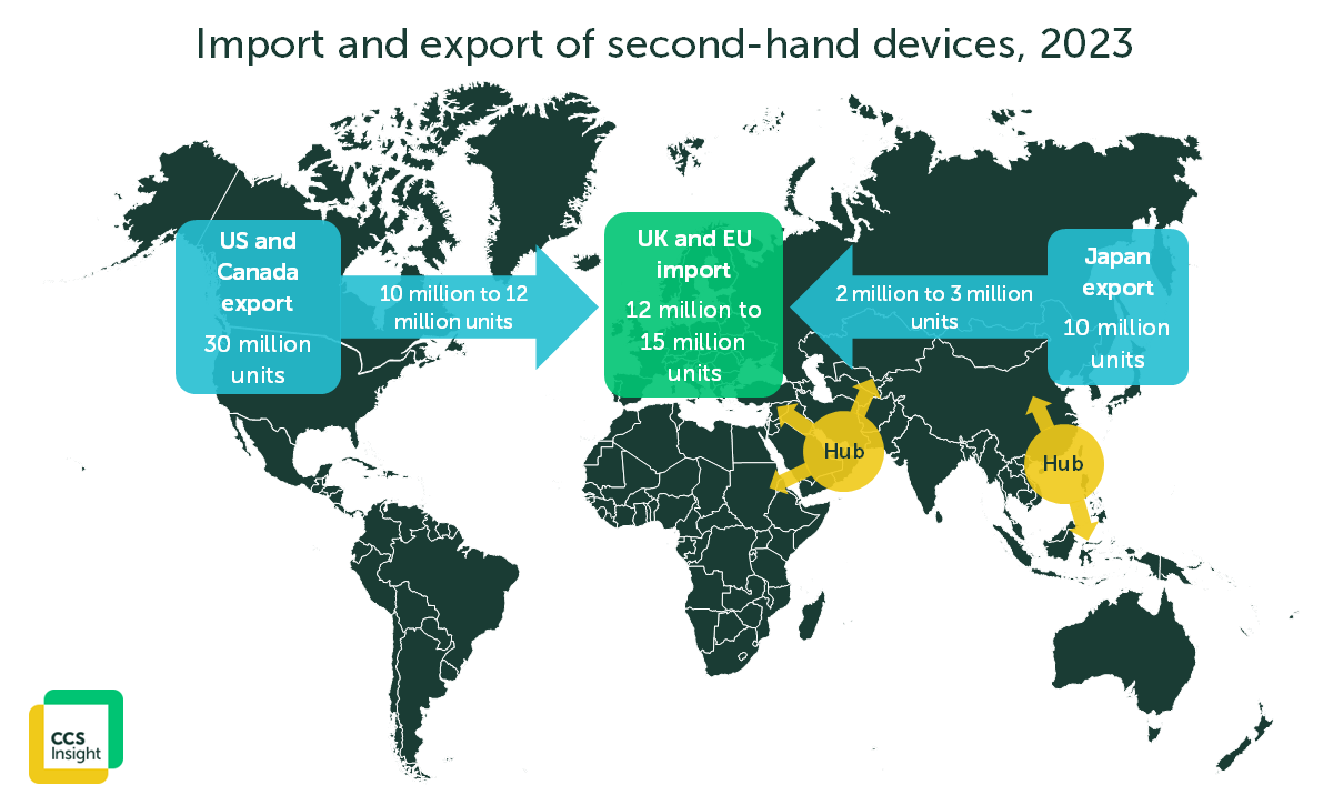CCS Insight observes that Europe is the greatest importer of used phones, primarily from the US as well as Japan and Singapore. Bryant adds, “This situation demonstrates Europe’s dependence on devices from other regions and, ultimately, the non-circular behaviour of consumers and channels in Europe despite their commitment to sustainability initiatives. The European telecom industry recognizes that it needs to address low trade-in throughout the region, but it’s still far off the pace of the US and Japan, which generate much higher volumes”.